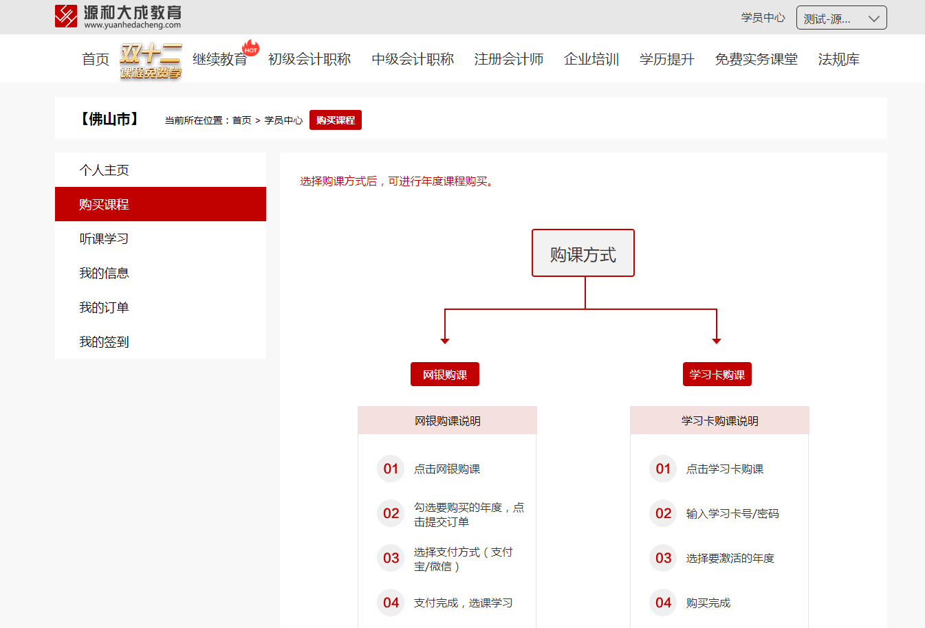 7、信息填写后,进入购买课程,有两种支付方式,个人学习点击网银购课,支持支付宝、微信付款。学习卡购课适用于团购,可联系专属客服:17722205377(微信同号)报名,如图10所示: