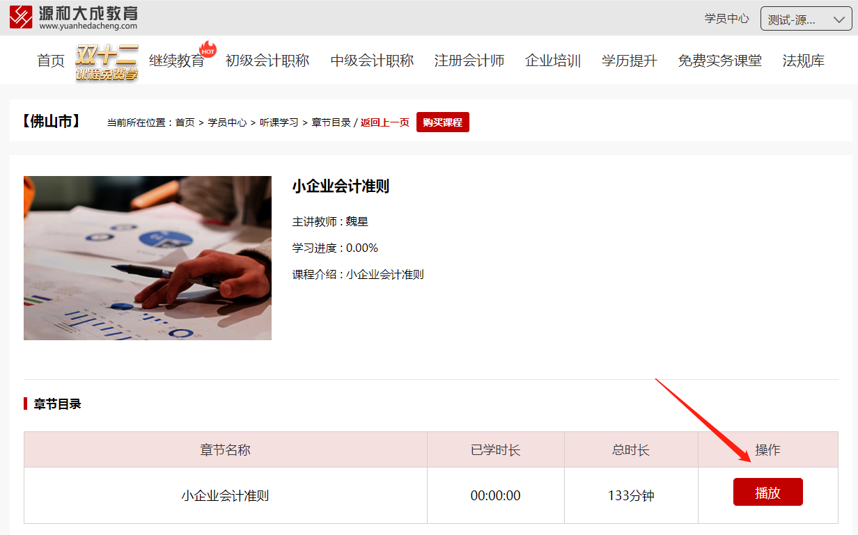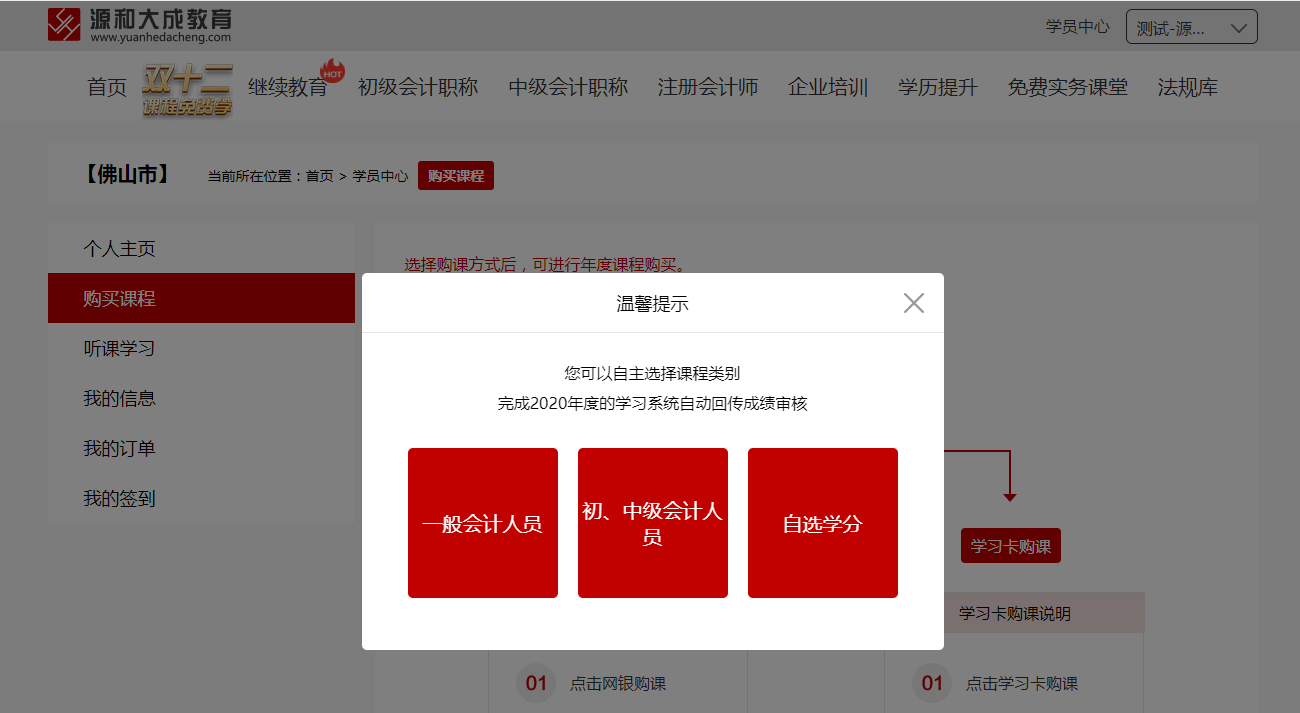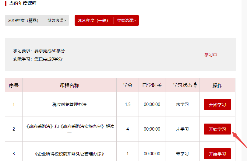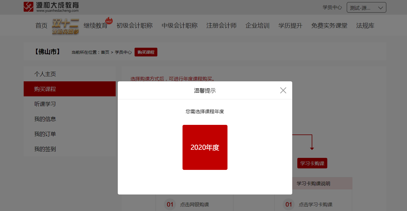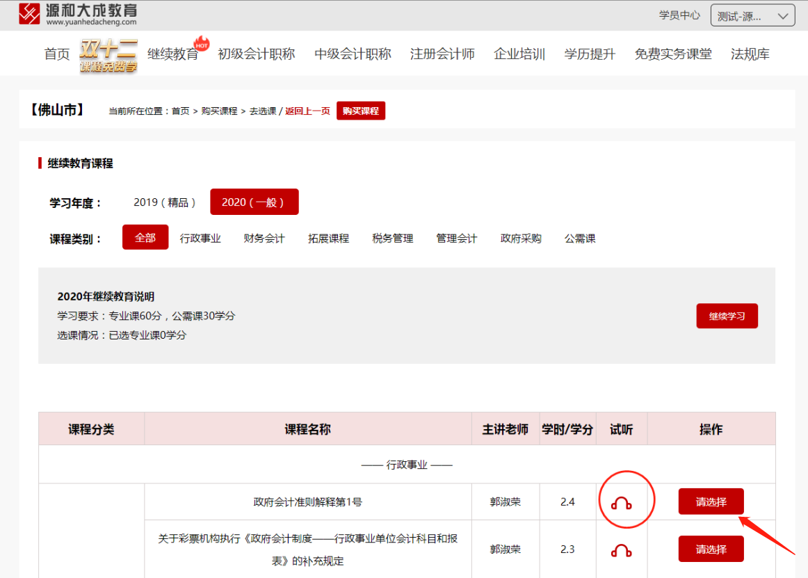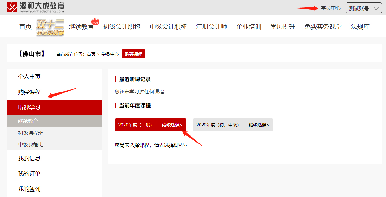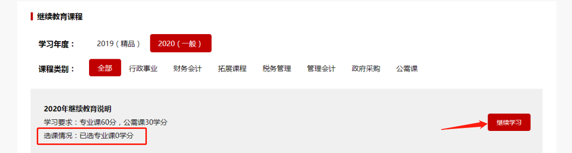 13、点击官网右上角进入“学员中心”,点击“听课学习”,当前年度课程能看到已经购买的课程,点击“继续选课”去选择所需要学习的课程。如图18所示: