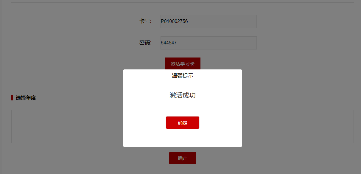 12、激活学习卡后,会显示学习卡相对应的课程,选择需要学习的年度,点击“确定”即可激活,即可开始去选择课程开始进行学习了。如图17所示。
