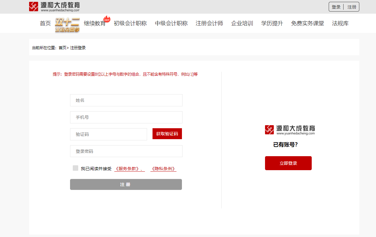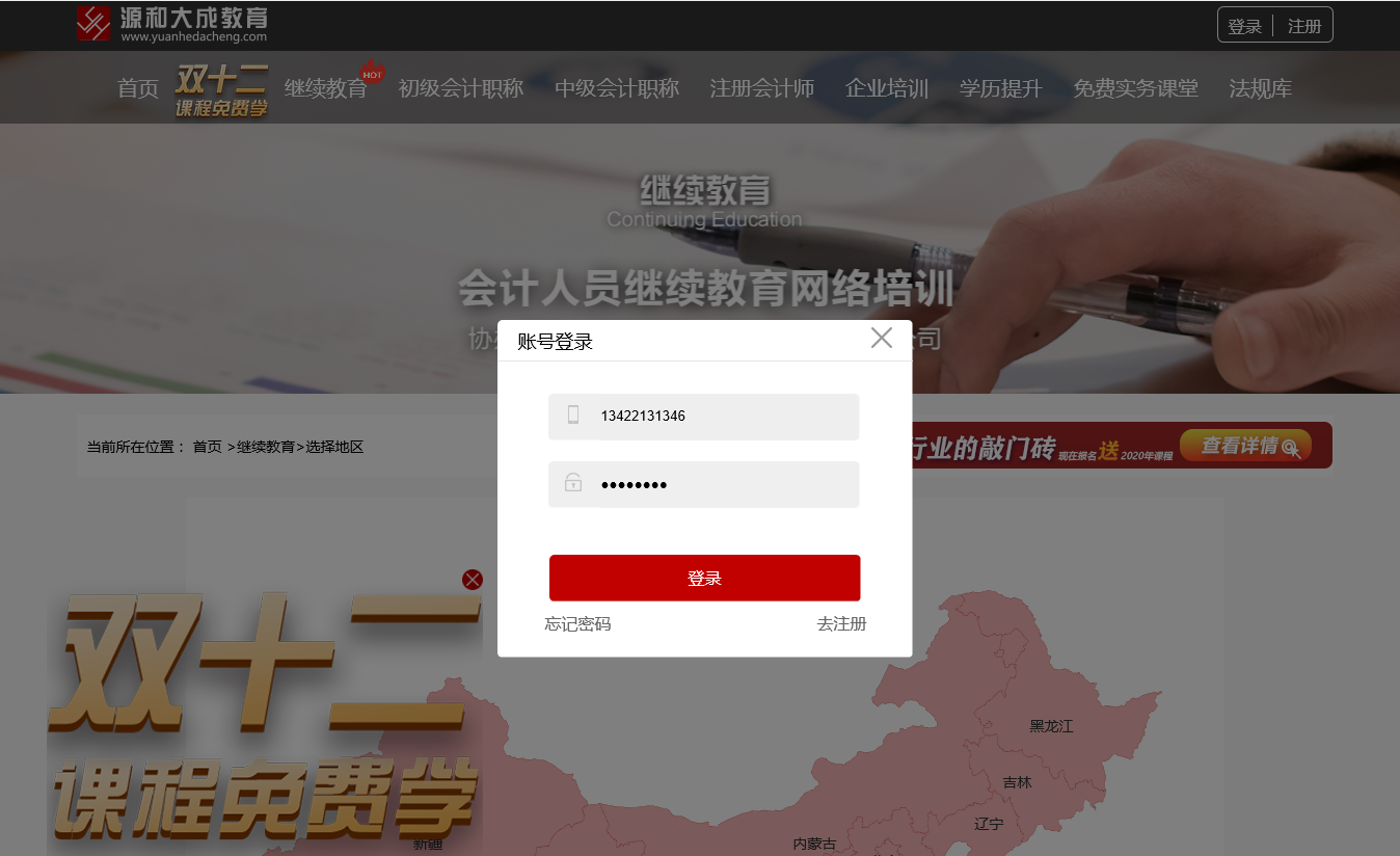 3、进入“继续教育”版块后在页面右上角点击“登录/注册”按钮,弹出账号登录框,输入您的手机号码、密码后,点击登录按钮。如图5所示: