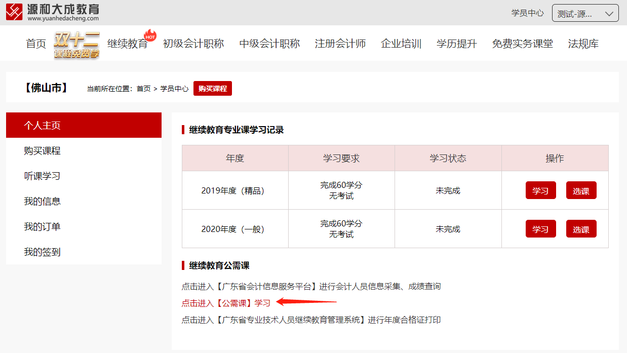 18、专业课学习完成,公需课还需要学满30学分,广东省(除深圳市外)地区会计人员,公需课可在“学员中心-个人主页”中点击公需课学习入口观看视频。如图25所示: