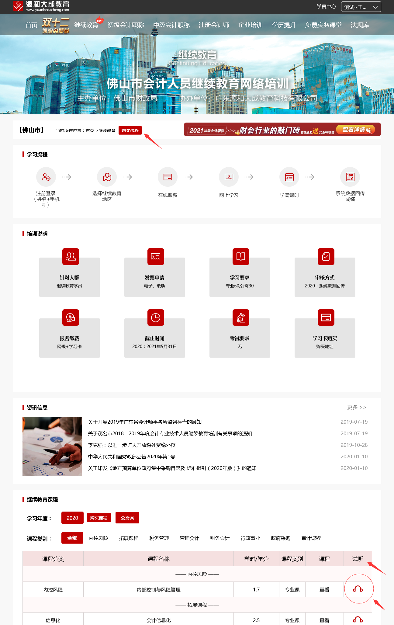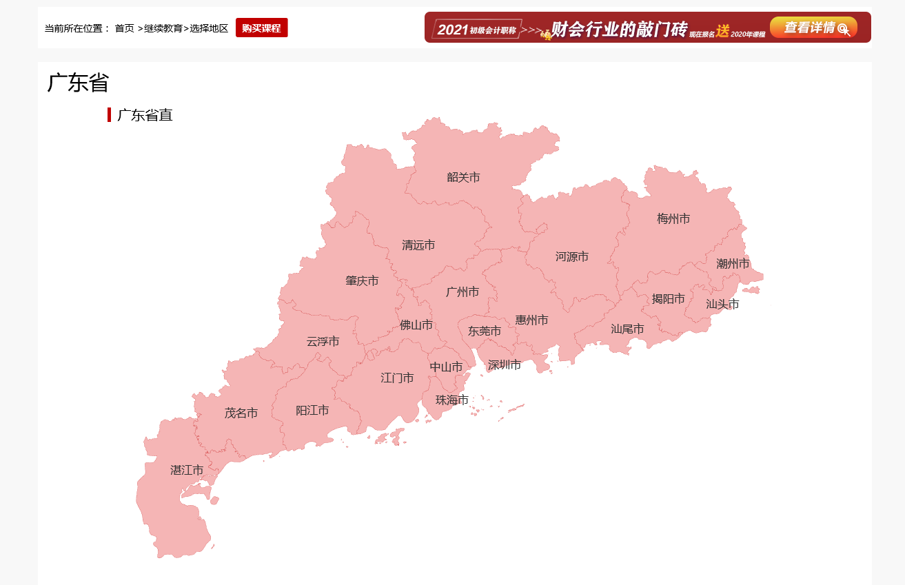 5、以佛山市为例,选择所在地区后,进入地区详情页,点击“购买课程”红色按钮,如图8所示(图8最下方右侧可以试听课程):